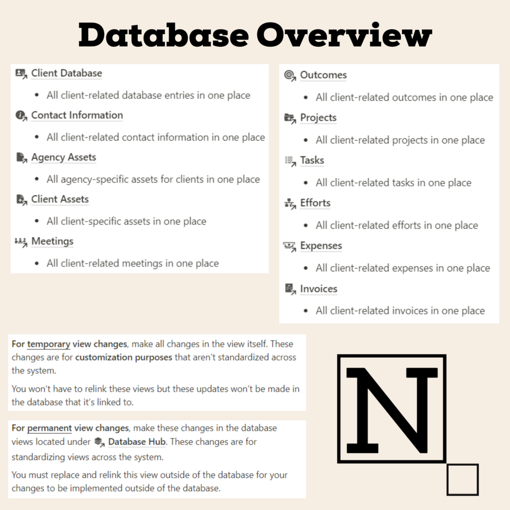 You don't need to be an agency to use this template! From business planning to client work, this all-in-one template offers a cost-effective solution for managing, organizing, and measuring business operations. It provides a ready-made set of dashboards and databases that can be used without the need for expensive software or tools.
