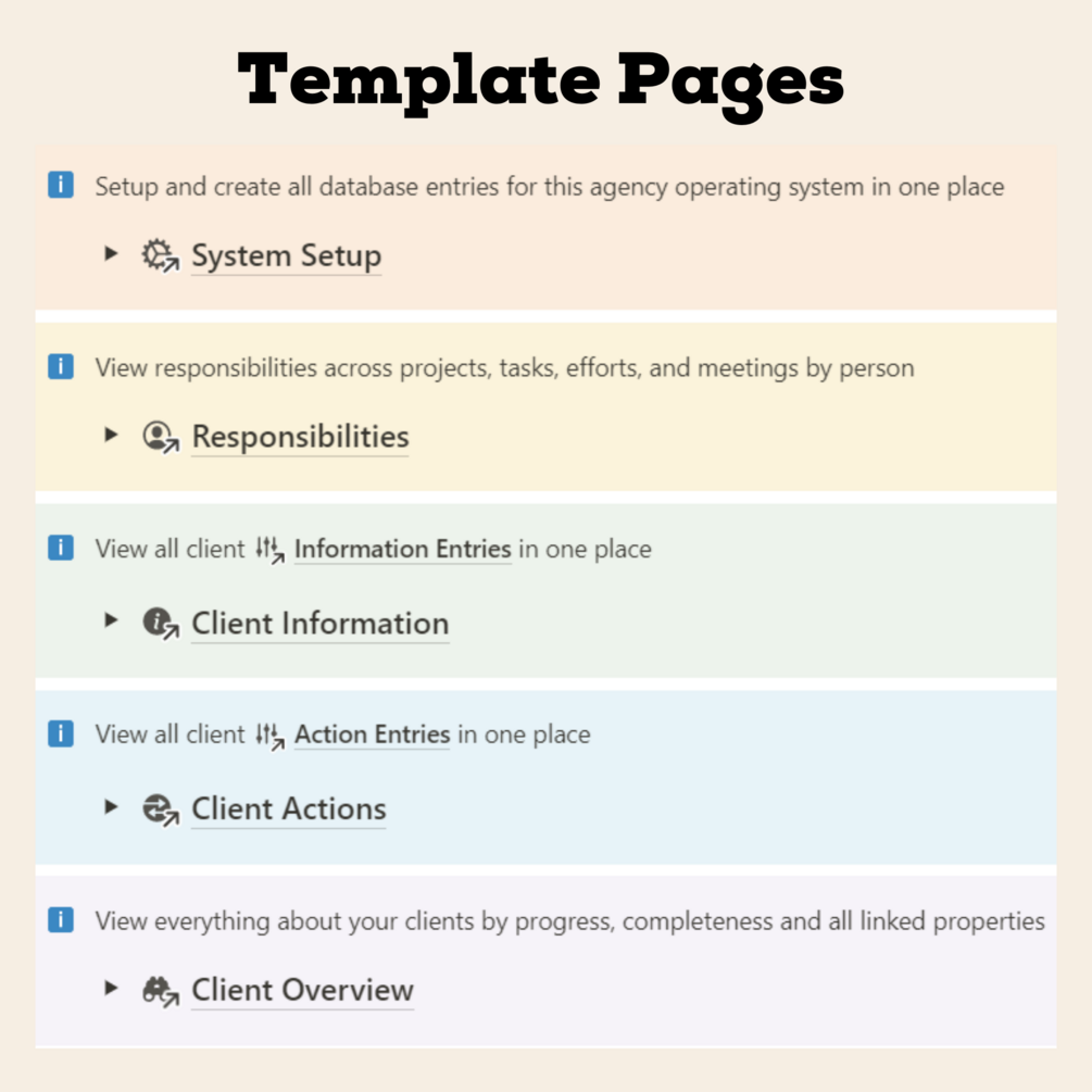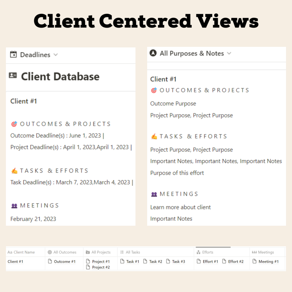 This Notion Template separates 10 of the 11 client databases into action and information action entries.