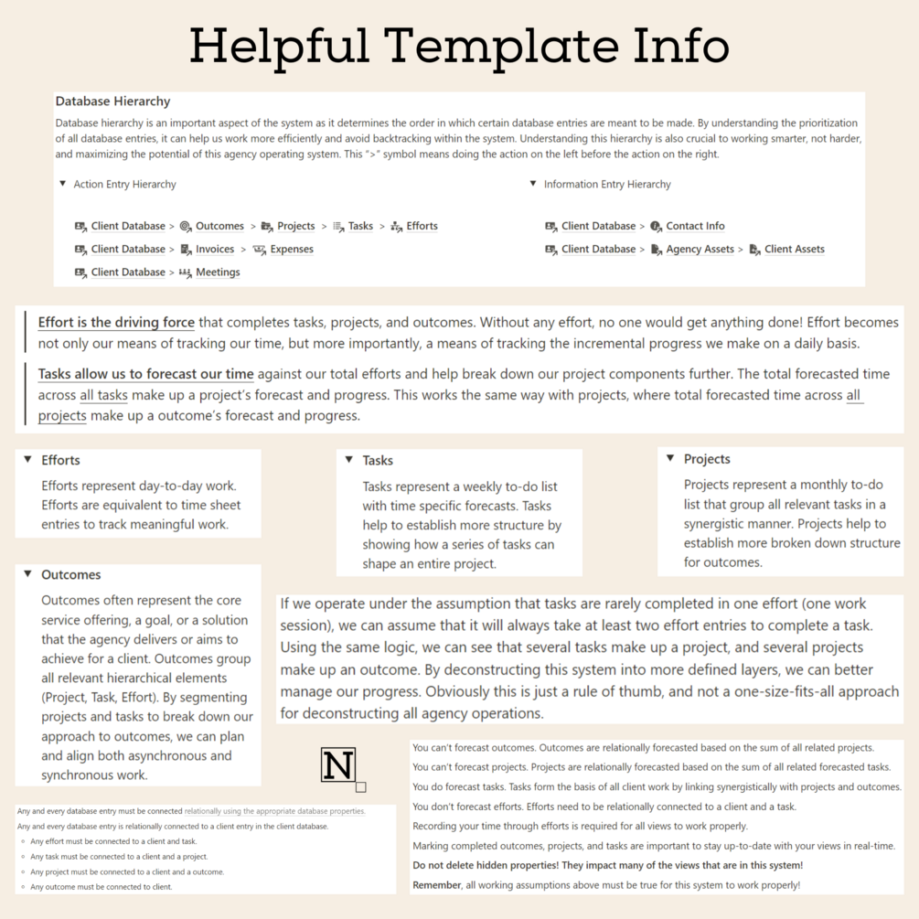 🎬 Action entries are what allow this agency operating system to function to its full potential. The system organizes all relevant actions taken to provide client service through dashboards, visualizations, and formulas. There are seven action databases: Outcomes, Projects, Tasks, Efforts, Invoices, Expenses, and Meetings.
