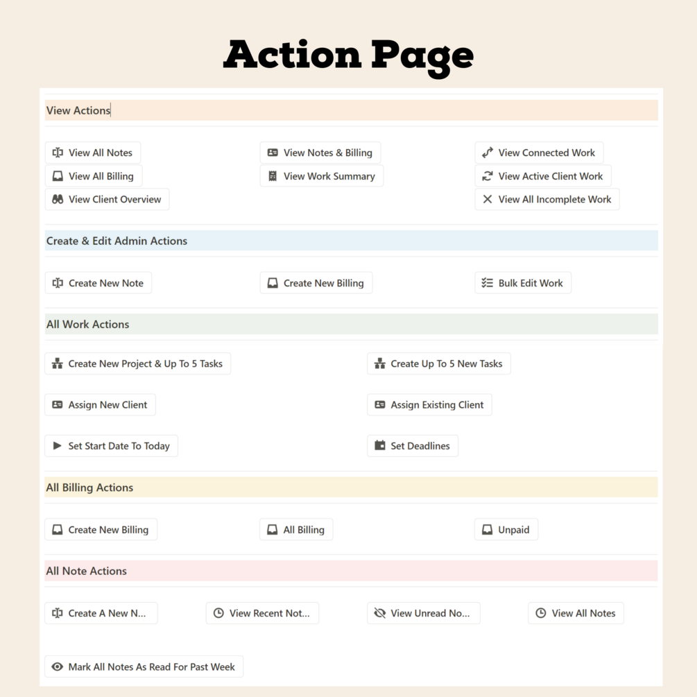 This freelancer OS is centered around the use of Notion Buttons. The 25 buttons located in the Action Page allow you to accomplish most, if not all database related actions without having to navigate or click on a specific page or view.