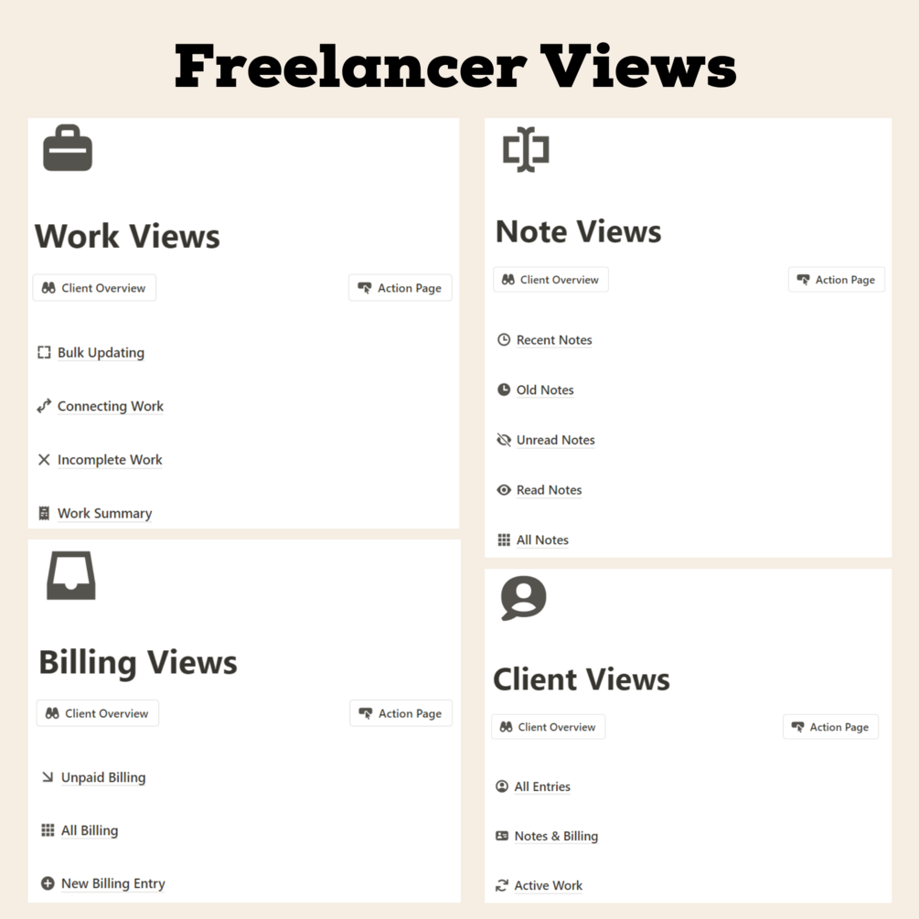 There are four databases to help you as a freelancer. Each Database has corresponding pages and views that are connected to the buttons in the Action Page.
