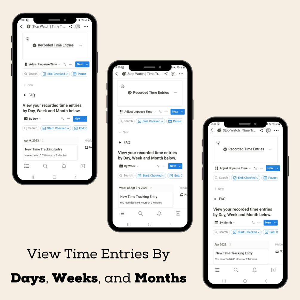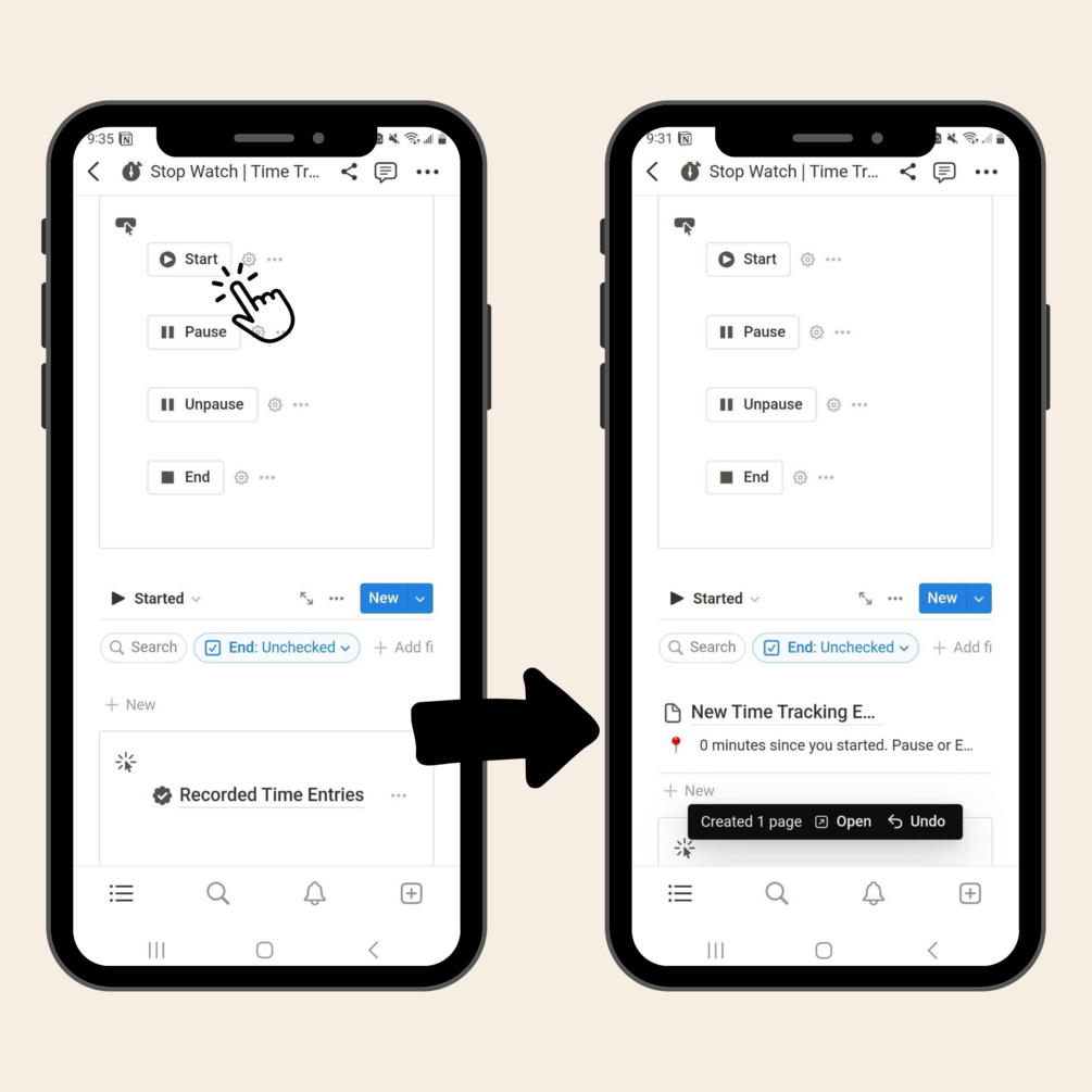 These Time Tracker & Timesheet Notion Templates generates automatic time stamps that track when you click on the start, pause, unpause, and end buttons.